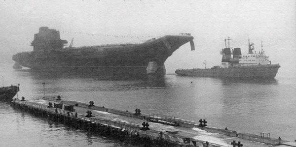 2005年4月26日,在6艘大马力拖船的牵引下,瓦良格缓缓进入大连造船厂30万吨船坞。开始了过程历时8年的改建。