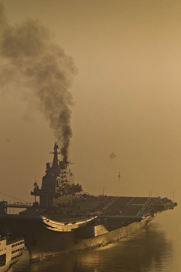 2012年9月25日,初秋的清晨,大连造船厂,朝霞给中国第一艘航母镀上一层金色,舰桥主烟囱冒出浓烟。当天上午,这艘舷号为“16”的航空母舰正式交付中国海军,并被命名为“辽宁舰”。