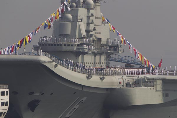 2016年11月,歼—15舰载战斗机列阵辽宁舰飞行甲板。 视觉中国 资料图