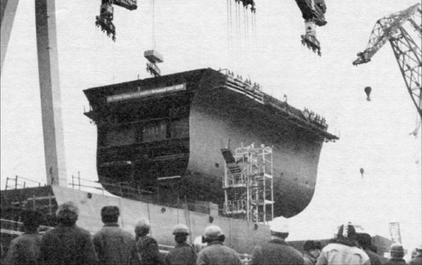 1988年,“瓦良格”号船体建造成功。当年11月25日,黑海造船厂克服了巨大的困难和危险,使巨舰的船体从倾斜船台成功下水。按照当初的设计,这两艘同级航空母舰的满载排水量为67000吨,全长310米,比美国“尼米兹”号航母仅短22米。