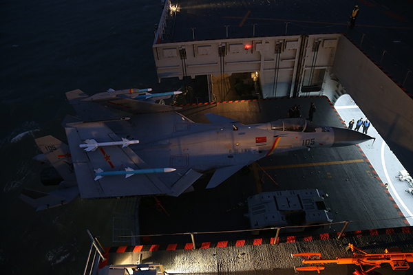 2015年12月25日,歼-15舰载战斗机通过升降机转运至机库。 视觉中国 资料图