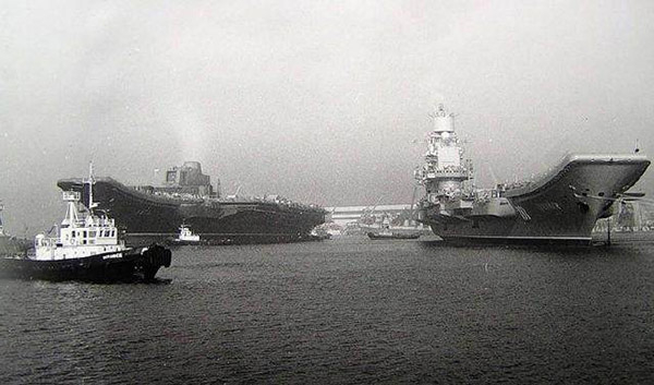 1985年12月,“瓦良格”号航母在乌克兰黑海造船厂造船台安家落户。这是苏联继刚刚完成建造和下水的“库兹涅佐夫“号航母之后,在造船台上实施建造的第二艘航母。图中右侧已经建好的航空母舰,就是现在的俄罗斯航母——库兹涅佐夫号,左侧没有建完的就是“瓦良格”号。