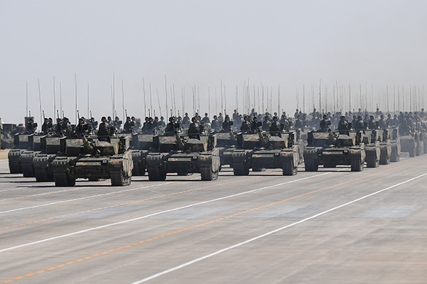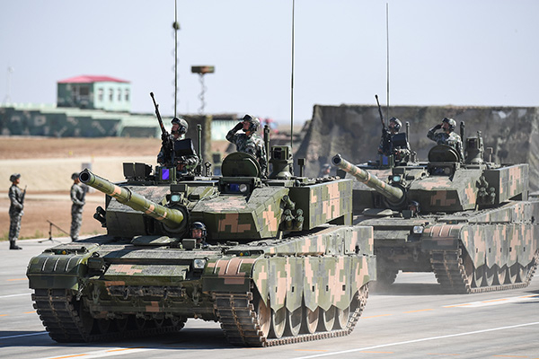 2017年7月30日,庆祝中国人民解放军建军90周年阅兵在位于内蒙古的朱日和训练基地举行。99A型主战坦克组成的坦克方队接受检阅。 视觉中国 图
