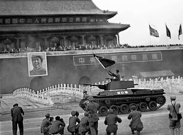 开国大典上,“功臣号”引领坦克方队通过天安门,接受检阅。
