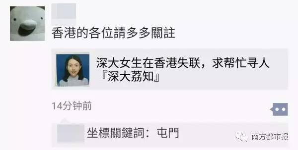 深圳大学女大学生罗琬璐上周六(7月29日)独自去香港后失联。手机于29日下午5点关机后再未开机。