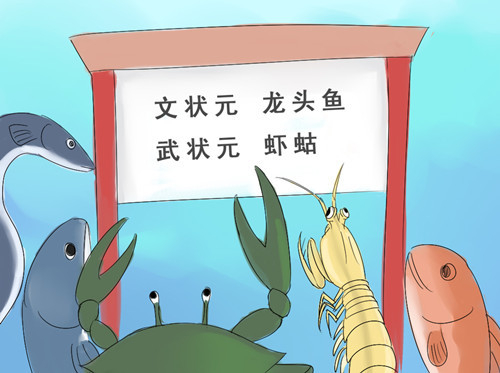 龙头鱼和虾蛄参加水族文武状元选拔会试,龙头鱼得了文状元,虾蛄得了武状元。