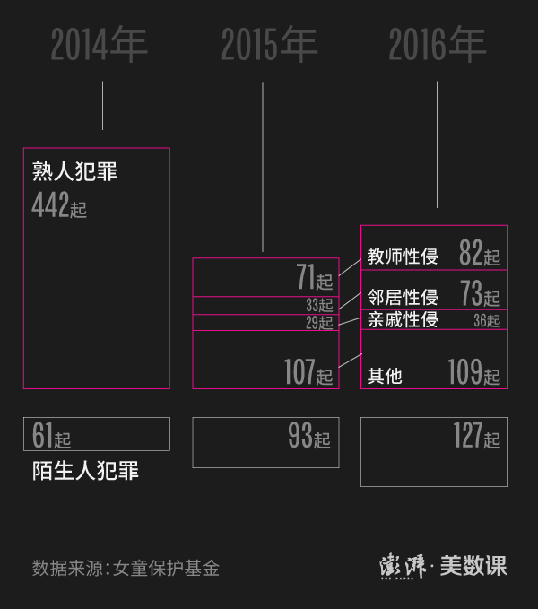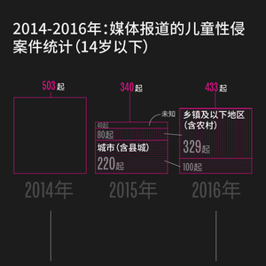 近几年,未成年人保护议题受到了公众越来越多的关注。据女童保护基金的统计,媒体报道的性侵儿童(14岁以下男童女童)案件从2013年的125起上升到2016年的433起(受害人约778人)。现实生活中,案件数量远高于媒体曝光起数:据最高人民法院6月1日新闻发布会,从2013年到2016年,仅猥亵儿童犯罪案件就已审结10782件。最高法正调研猥亵儿童情节恶劣的认定标准。