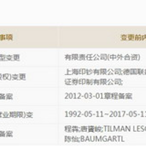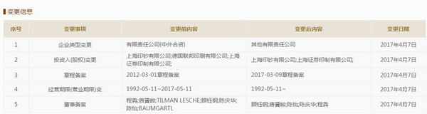 2017年4月7日,上海密特发生股权变更,变更前投资人为上海印钞有限公司、德国联邦印刷有限公司和上海证券印制有限公司,变更后“德国联邦印刷有限公司”一项消失。同时,TILMANLESCHE和BAUMGARTL不再是公司董事。