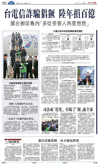 香港《大公报》曾用整个版面报道台湾电信诈骗。(图片来源:《大公报》)