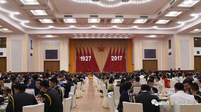 人民大会堂宴会厅灯火辉煌,洋溢着节日的喜庆气氛。主席台帷幕中央悬挂着巨型“八一”军徽,两旁是十面鲜艳的红旗。“1927-2017”几个醒目的大字,昭示着中国人民解放军走过了90年的光辉历程。18时许,在欢快的《迎宾曲》乐曲声中,习近平等党和国家领导人步入宴会大厅,同1800余名中外来宾欢聚一堂。