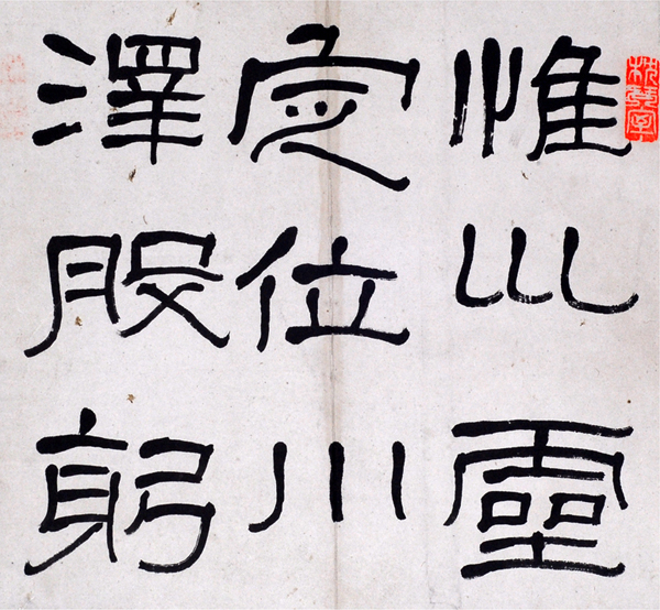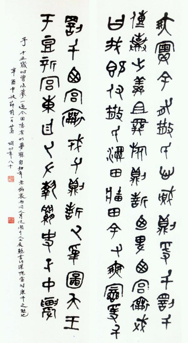 先生书以"三石一盘”(石鼓文、石门颂、石门铭、散氏盘)为基,用工至勤,朝斯夕斯,一生不废。集奇气、豪气、磊落气、丈夫气于一身,得苍浑、厚拙、遒润书风。先生喜作擘窠大字,挥毫落纸如江河行地,如“道登天门”尤见其豪迈胸襟。喜作对联,所择联语亦多气魄雄大,与其书风相表里,更觉浑然一体。其巾帼气概,磊落慷慨,不知折服多少须眉男儿。撰联"书中有我,眼底无它",道出其睥睨千古,独立苍茫的自信与豪壮!“楼船夜雪,铁马秋风 ”、 “大江东去 ,天马南来”又承寄其多少豪情!先生喜执大笔,饱醮水墨,着纸则如犁耕大地,似春雨润物,其书法结体的张力和内在气韵暗合着上联与下联的音律、气势,成为形式与内容完美的整体!