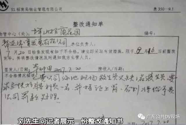 刘先生提供的另一份由小区物业下发的“整改通知单”则显示,物业方于7月20日巡查时发现,泳池现场缺一名救生员,要求经营方“尽快补员一名,并持证上岗,否则将给予罚款处理。”