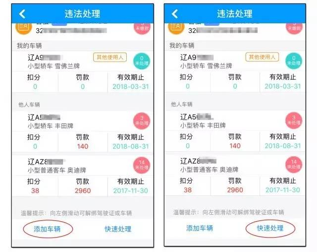 用户可以选择“添加车辆”,根据提示填写车辆信息,先绑定再处理违法。也可以选择“快速处理”,根据提示填写车辆信息后直接处理违法,系统会自动绑定该车辆。