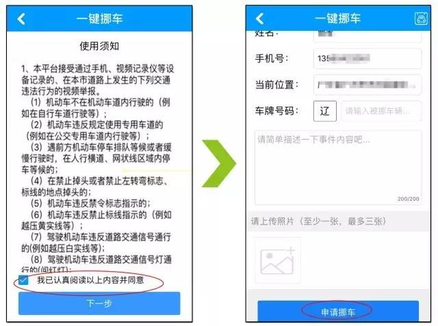 软件会弹出免责条款,用户认真阅读同意后,勾选“我已认真阅读以上内容并同意”并点击“下一步”。填写挡路车辆的车牌号码,系统将自动识别用户当前位置,用户现场拍摄挡路车辆号牌和现场情况的照片,然后点击“申请挪车”。