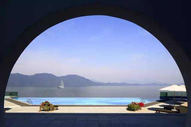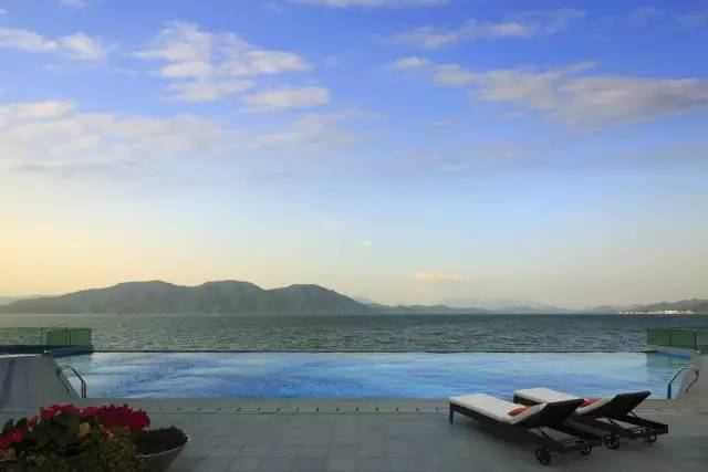 当我看到酒店无边泳池的第一眼,我就变成他家的脑残粉:弧形设计、与湖相接、0距离直面青山碧水,哪怕在泳池里静静泡上一整个盛夏,我也心甘情愿——因为这里泳池私藏的碧水湖光太美,放在柜子一个冬季的比基尼终于可以拿出来啦!