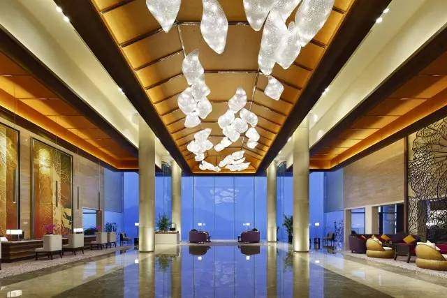 ▲几乎与湖面平行的酒店大堂,吊灯如璀璨般明珠闪烁