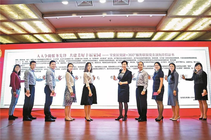 4月7日,宝安区举行党建+360°服务联盟成立暨基层党群服务专项资金新闻发布会,依托区十大服务中心,为群众提供360度全方位社会公共服务。图为区十大服务中心主要负责人联合签署党支部先锋倡议书。(图 邹扬科)