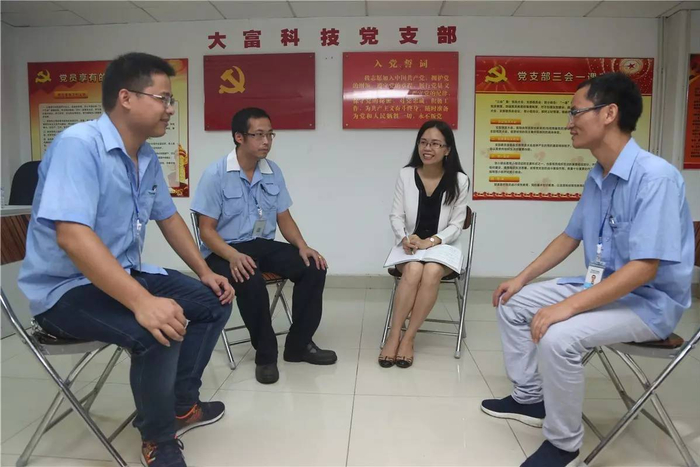 坐落在宝安沙井蚝乡路上的大富科技股份有限公司,是宝安区“党建百强企业”之一。园区宿舍楼下,党旗飘扬的宣传栏点缀着走廊,党员的闪光言行、党务公开宣传、党的光辉历程等在墙上图文并茂展示着。党群服务中心活动室内,3名工人与公司党支部书记冯小敏正围坐一圈,从工作聊到生活,从理想聊到人生。对于34岁的冯小敏来说,这样的谈心已成为她日常工作中不可或缺的一部分。