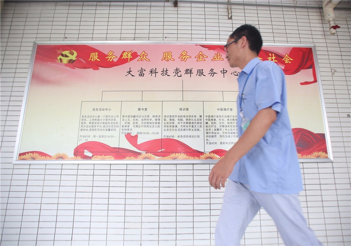 大富科技股份有限公司是宝安区“党建百强企业”之一。园区宿舍楼下党旗飘扬的宣传栏点缀着走廊。