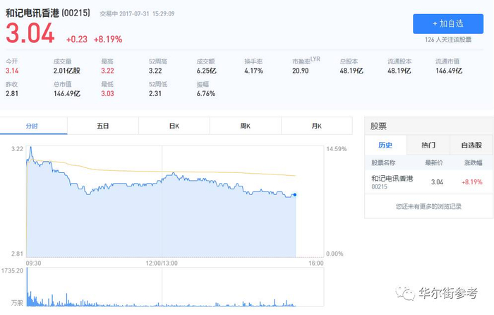 当天,和记电讯香港控股股价高开,截止目前涨幅8.19%。