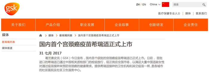 7月31日,英国制药企业葛兰素史克(GSK)官网显示,中国内地首个获批的宫颈癌疫苗“希瑞适” (人乳头状瘤病毒HPV疫苗[16型和18型])已正式上市。日前,首批进口的希瑞适已通过中国相关质检部门的检验放行,现正供应全国市场。
