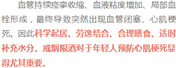 定期健康体检,早期发现、早期预防、早期治疗则有助于早期干预心肌梗死的相关发病危险因素如高血压、高血脂、糖尿病等,从而防范中青年心肌梗死的发生。