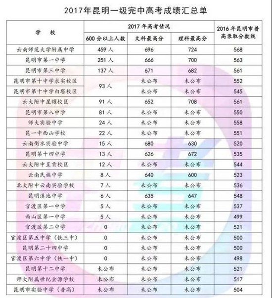 对比两年各校分数线,虽然略有差别,但进入前20的学校名单基本一致。再看看今年昆明高考成绩单,这些学校的分数线高也不是没有道理的。