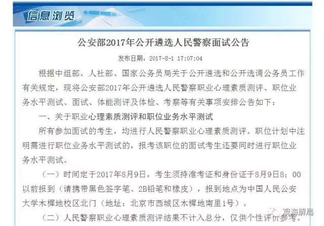 法制晚报·看法新闻 今天(8月1日)下午,公安部发布了2017年公开遴选人民警察面试公告。