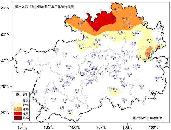 据贵州省山地气候研究所统计,今年7月,遵义市和铜仁市大部、黔东南州北部日照时数较常年偏多3-6成,月平均气温较常年偏高1.0—2.5℃;月降水主要集中在西部、西南部以及东南部,遵义市大部、铜仁市大部以及黔东南州北部降水少,较常年偏少5—9成。