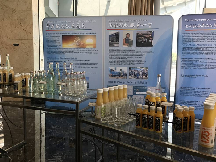 从现场的照片可以辨认出来,农夫山泉玻璃瓶天然矿泉水,再一次出现在了这些金砖会晤先期会议的会场上。