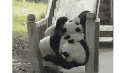 大熊猫室外馆用巨大的松木做了一堵墙,将室外馆分隔成两个完全独立的空间。室外管的空地都是土地,没有装修也没有硬化,除了几棵低矮的灌木,没有多少绿化。一棵人造树矗立在空地上,格外引人注目。原来,大熊猫爱爬树,但一般的树木是禁不住大熊猫攀爬的,而因为气候原因又无法种植南方树种,只好用人造假树委屈一下大熊猫了。室外馆外围是“护城河”一样的排水沟,“护城河”上面有电网,距离游客落差在3米左右。