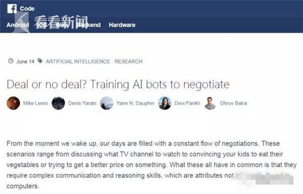 事实上,早在6月16日Facebook人工智能研究团队的一个实验小组的成员就在开源博客中公布了该实验的相关内容,这次实验的研究成果也同日发表。在一篇名为Deal or no deal? Training AI bots to negotiate(《成交还是不成交?训练AI机器人谈判》)的博客中,Facebook人工智能研究小组介绍称,该实验项目的主要任务是为了训练AI机器人进行谈判。