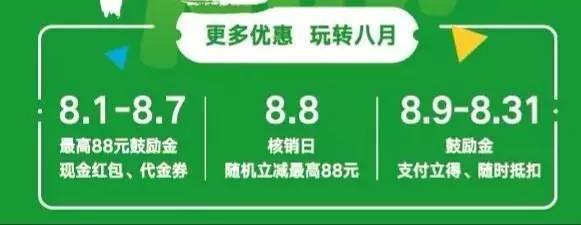鼓励金最高88元,攒着到8月8日这天,一起抵现用。