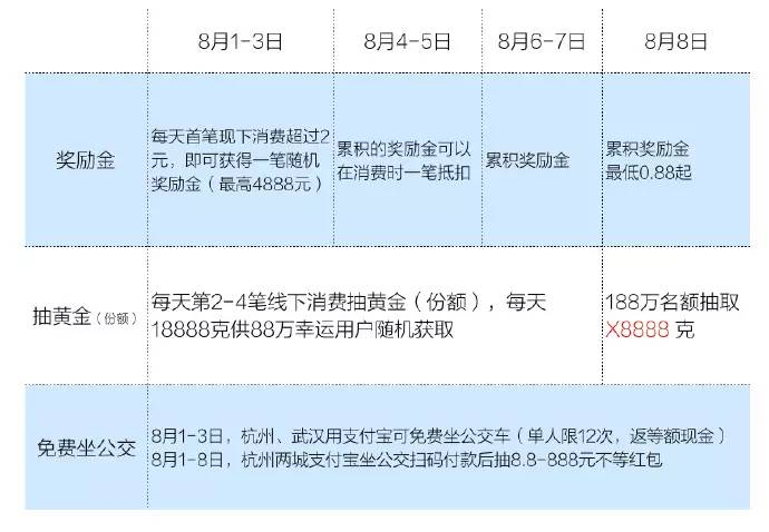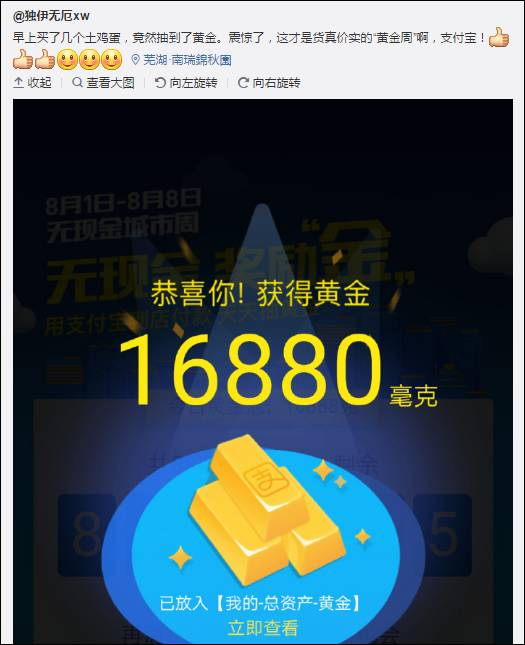 8.1-8.8,扫码支付满2元超过2笔,可以抽一次黄金,第3笔再抽一次,第4笔再抽一回。