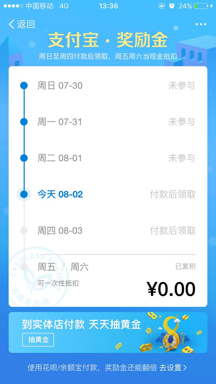 常用支付宝的人一定不陌生,每周日到周四,在线下有支付宝标识的商家(个人转账除外)扫码支付超过2元,可以领一份奖励金,一天一次。