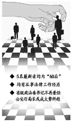 记者梳理公开资料发现,在上周省级政法部门人事调整中,5名履新者包括一名省委政法委书记、4名公安厅(局)长均为“60后”,且均有从事法律工作的经历,省级政法委书记不再兼任公安厅(局)长或成大势所趋。