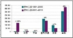 高温热浪的频发严重威胁人体健康,使人体不能适应环境,超过人体的耐受极限,从而导致疾病的发生或加重,造成大量的伤亡。高温天气引发的伤亡率在各类气象灾害中位居前列,据世界气象组织统计,高温造成的伤亡人数从1991-2000年的6000人急剧增长到2001-2010年的136000人,增幅超过2000%,远高于所有极端天气(包括高温、冷冻、干旱、洪涝和风暴)总共造成的伤亡增长率(20%)(图2)。