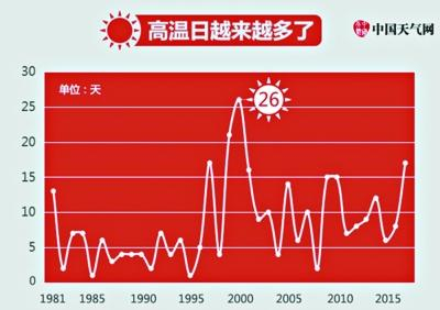 1981年来,北京5-8月高温日出现越来越频繁,尤其是上世纪90年代末期以来年均高温日超过10天,最多一年达26天。