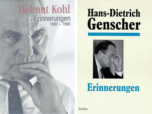 相比之下,来自于联邦德国亲历者的回忆就显得略有不足。对于想要了解德国统一进程的读者而言,自然需要聆听来自波恩的声音,尤其需要了解当时科尔总理与外交部长根舍在这一伟大事件发生过程中的所思所为。然而,这两位重要当事人的回忆是如此的“厚重”(Helmut Kohl, Erinnerungen 1982-1990, München: Droemer Verlag, 2005; Hans-Diertrich Genscher, Erinnerungen, Berlin: Siedler Verlag, 1995.),以至于如今都尚未被译成中文。
