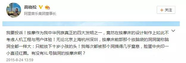 高晓松曾经发微博吐槽,嫌弃按摩床放脑袋的洞太小,每次按摩,脸都会压出一圈红印。