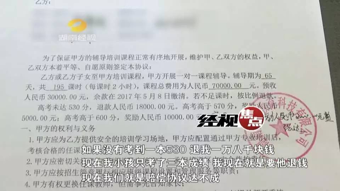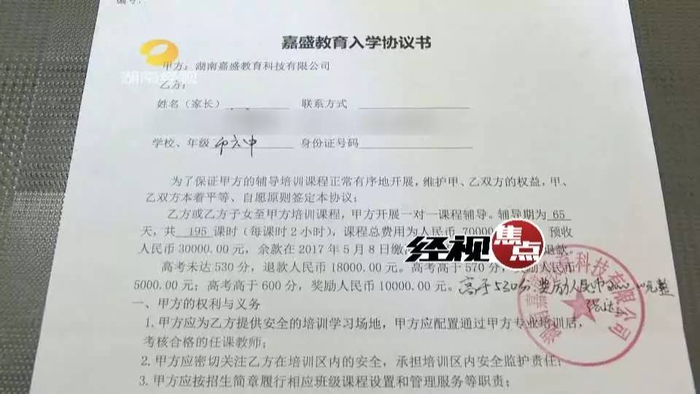 为了让邹女士放心,这个名为“嘉盛教育科技有限公司”的培训机构还与邹女士签订了一份入学协议书,如果孩子没有考到一本,就退款1.8万元。