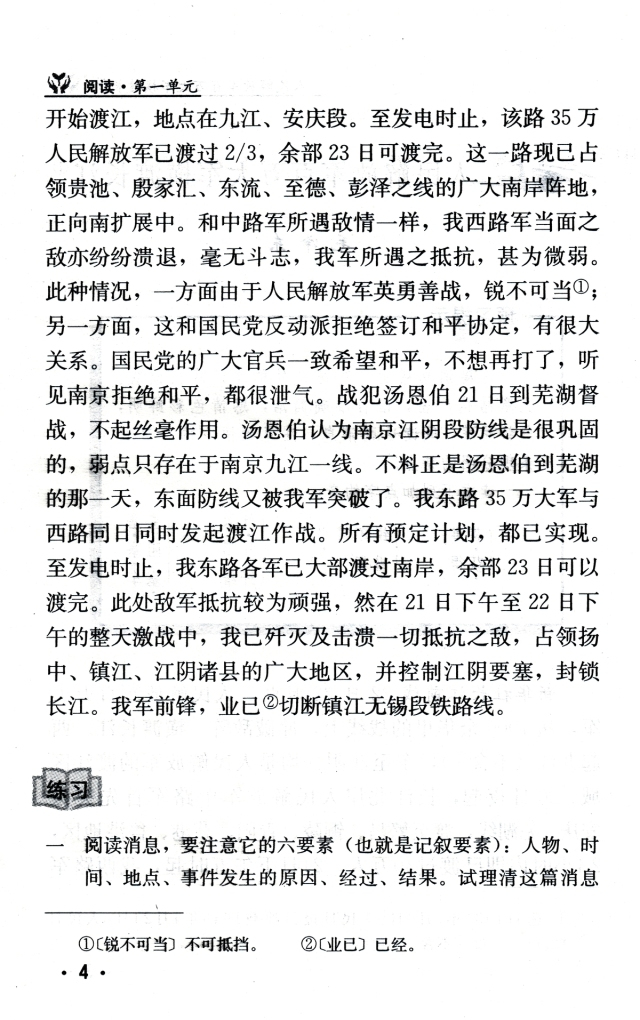 《人民解放军百万大军横渡长江》是一篇新闻报道的经典篇目。人民解放军南渡长江,揭开了解放全中国的序幕。这一战役声势浩大,人民解放军百万大军,从1000余华里的战线上,冲破敌阵,横渡长江。正文只用了区区199字,便做了简洁而不失完整的报道。