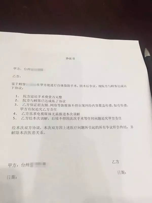 双方多次交涉后,于6月22日,在台州经济开发区区西派出所,进行第一次调解。拟定了一份协议,医院同意退还汪女士第一期分期付款,即2800元,银行终止后面的分期付款,让她签订一份“医疗纠纷终止协议”。结果,汪女士当场拒绝签字,至今,那2800元,也被银行从她的卡上扣走。