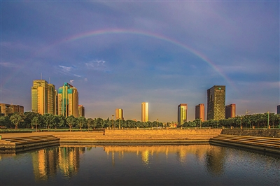 2日早晨,受双台风外围影响,南通上空云系丰富,随着太阳的升起,西边云层中出现一道彩虹。 钱伟章 摄 视觉江苏网供图