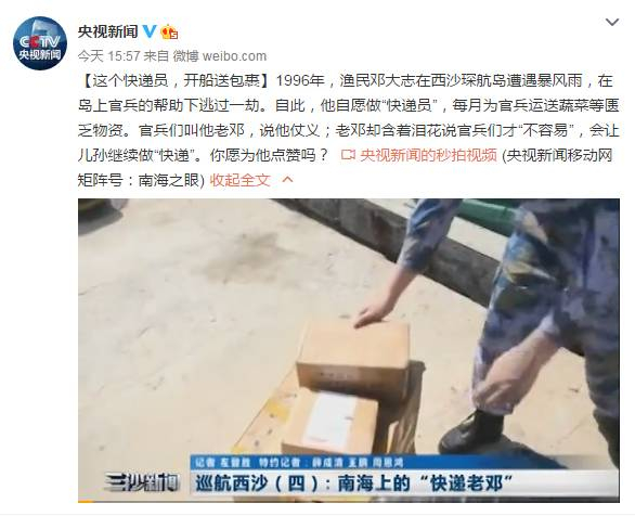 【这个快递员,开船送包裹】1996年,渔民邓大志在西沙琛航岛遭遇暴风雨,在岛上官兵的帮助下逃过一劫。自此,他自愿做“快递员”,每月为官兵运送蔬菜等匮乏物资。官兵们叫他老邓,说他仗义;老邓却含着泪花说官兵们才“不容易”,会让儿孙继续做“快递”。你愿为他点赞吗? (央视新闻移动网 矩阵号:南海之眼)