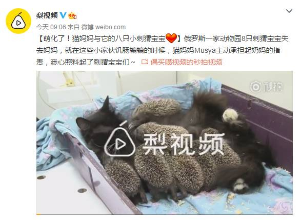 【萌化了!猫妈妈与它的八只小刺猬宝宝】俄罗斯一家动物园8只刺猬宝宝失去妈妈,就在这些小家伙饥肠辘辘的时候,猫妈妈Musya主动承担起奶妈的职责,悉心照料起了刺猬宝宝们~