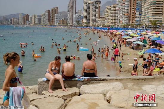 资料图:游客在西班牙贝尼多姆的海滩享受日光浴。