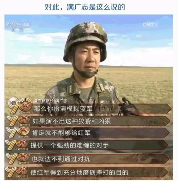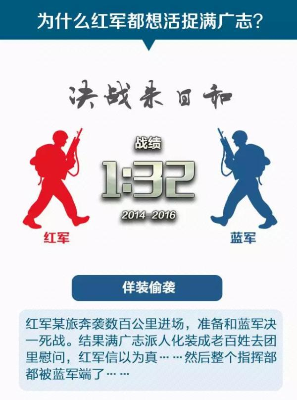 2015年6月,“跨越—2015·朱日和”系列实兵对抗演习打响。面对满广志一系列辉煌战绩,部分红军部队甚至打出了“踏平朱日和,活捉满广志”的口号。
