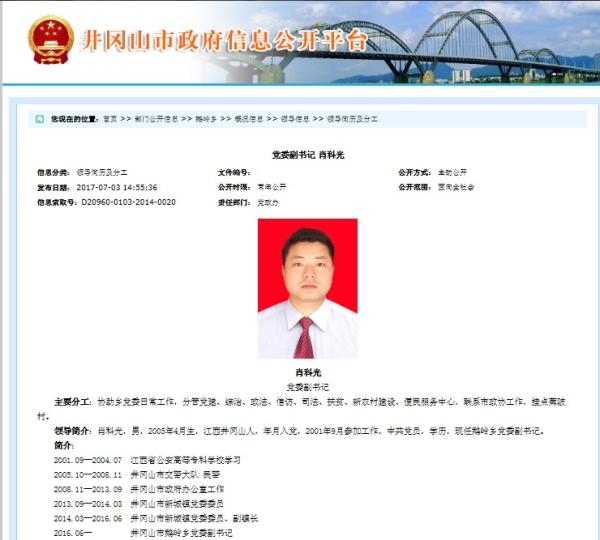 3日中午,鹅岭乡政府办公室工作人员回复澎湃新闻称,井冈山市政府网站公布的肖科光简历有误,正确的出生日期为1984年10月,会马上更正。