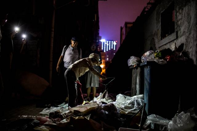 ▲80岁的张秀兰房子被骗过户后被扫地出门,晚上在24小时营业的肯德基店过夜,白天他们去医院里坐着。图为老人在楼下整理他们的行李。